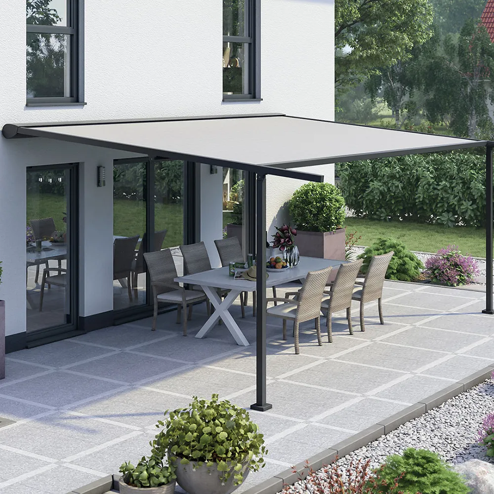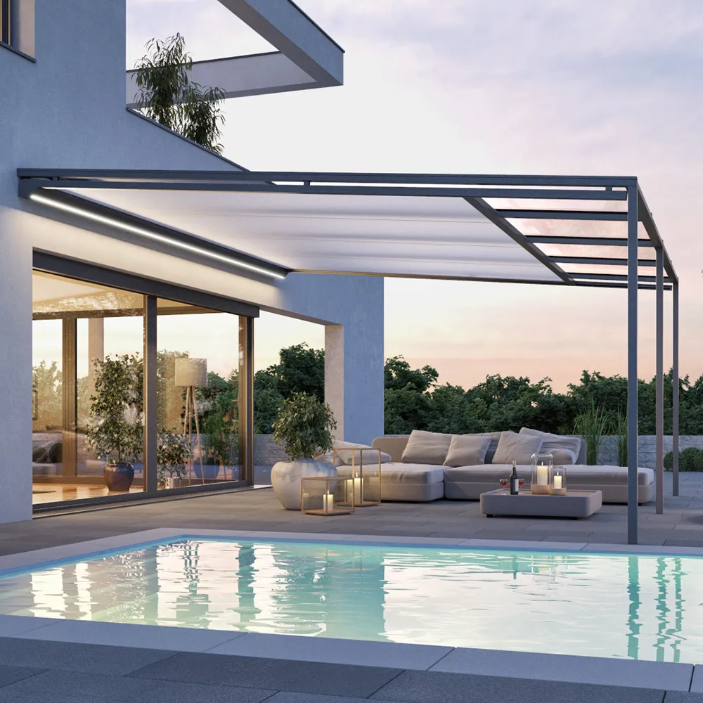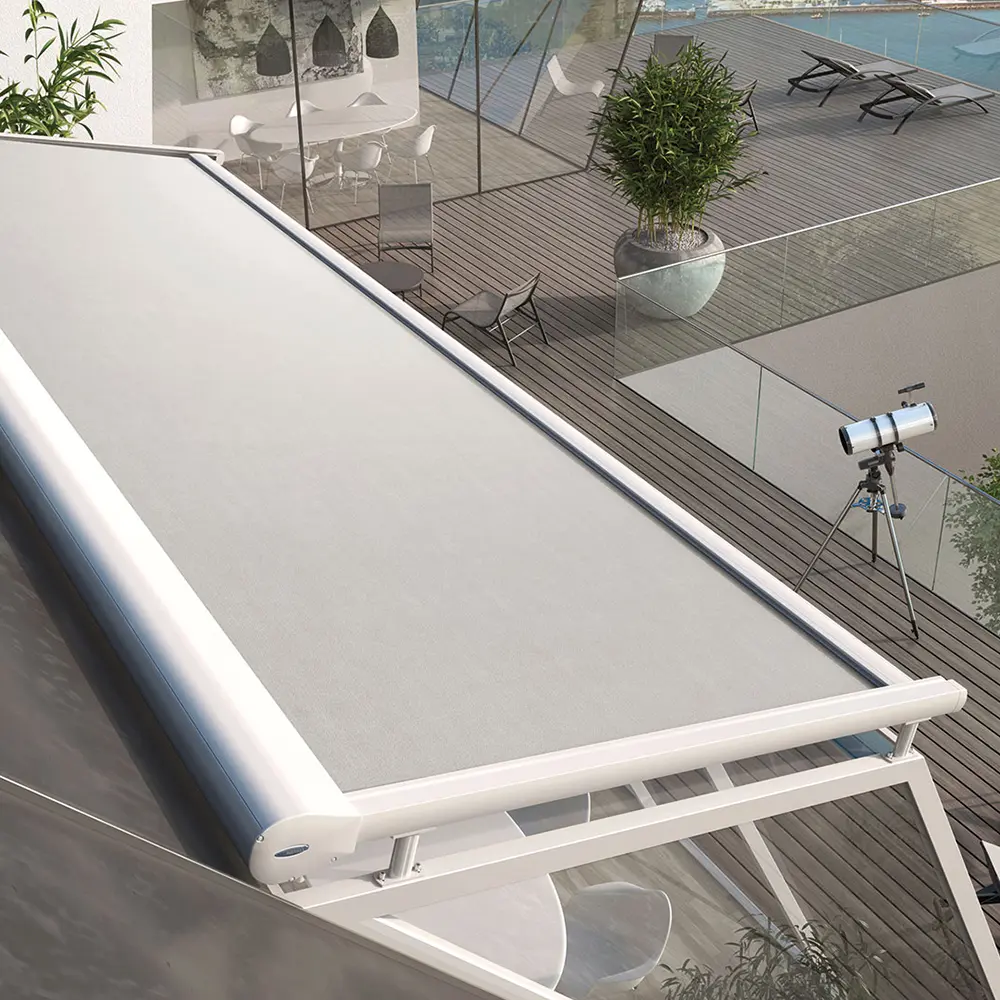 Die PGM 2600 / 2600 ZIP verwandelt Terrassen in stilvollen Lebensraum. Ihr formvollendetes Design veredelt jeden Außenbereich, individuell passend zu Ihrem persönlichen Stil und Ihrer Immobilie. Eine optional erhältliche, absenkbare Stütze erleichtert das Abfließen von Regenwasser, wenn die Anlage bei leichtem Regen als Wetterschutz eingesetzt wird. Das optional mit ZIP-geführte Tuch sorgt für lückenlose Beschattung und maximale Tuchspannung.