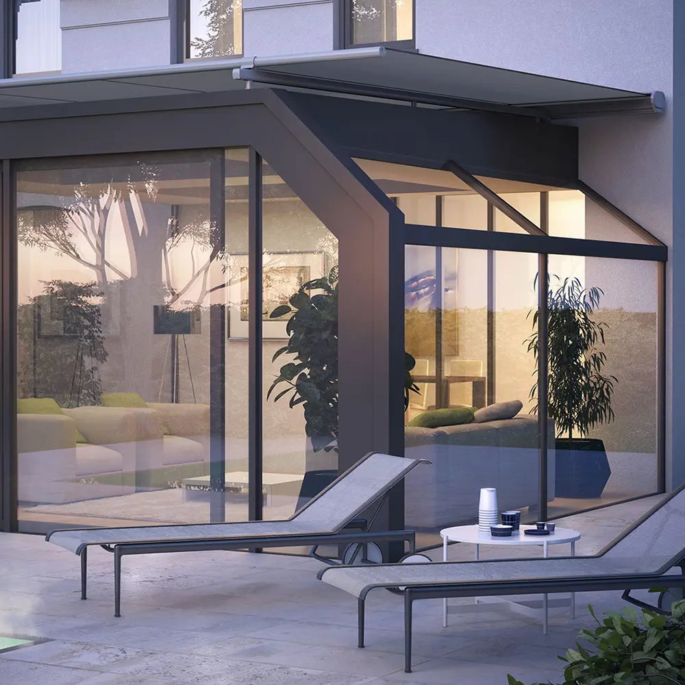 Eine Unterglasmarkise für besondere Ansprüche: die kompakte Anlage überzeugt durch hochwertige Komponenten und eine markante Formensprache. Durch die Führung des Behangs in der Schiene erhalten Sie puren Schatten, zudem sorgt das ZIP-System für ein tadellos gespanntes Tuch in jeder Ausfahrposition. Als besonderes Highlight ist eine Ambientebeleuchtung optional verfügbar.
