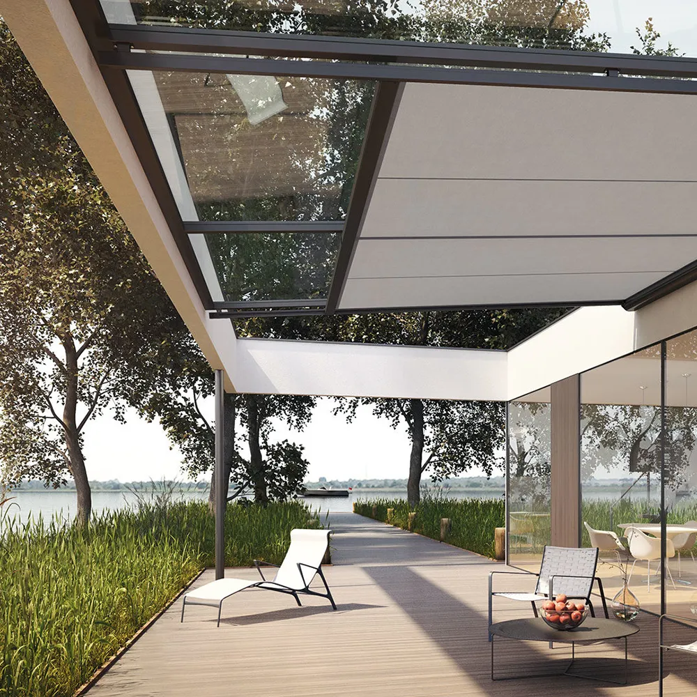 Die große Schwester der PGM 700 ZIP beweist über Glas ihre Stärken. Wie auch bei der Unterglasmarkise PGM 700 ZIP sorgt die Führung des Behangs in der Schiene für durchgehenden Schatten und eine hervorragende Tuchspannung.